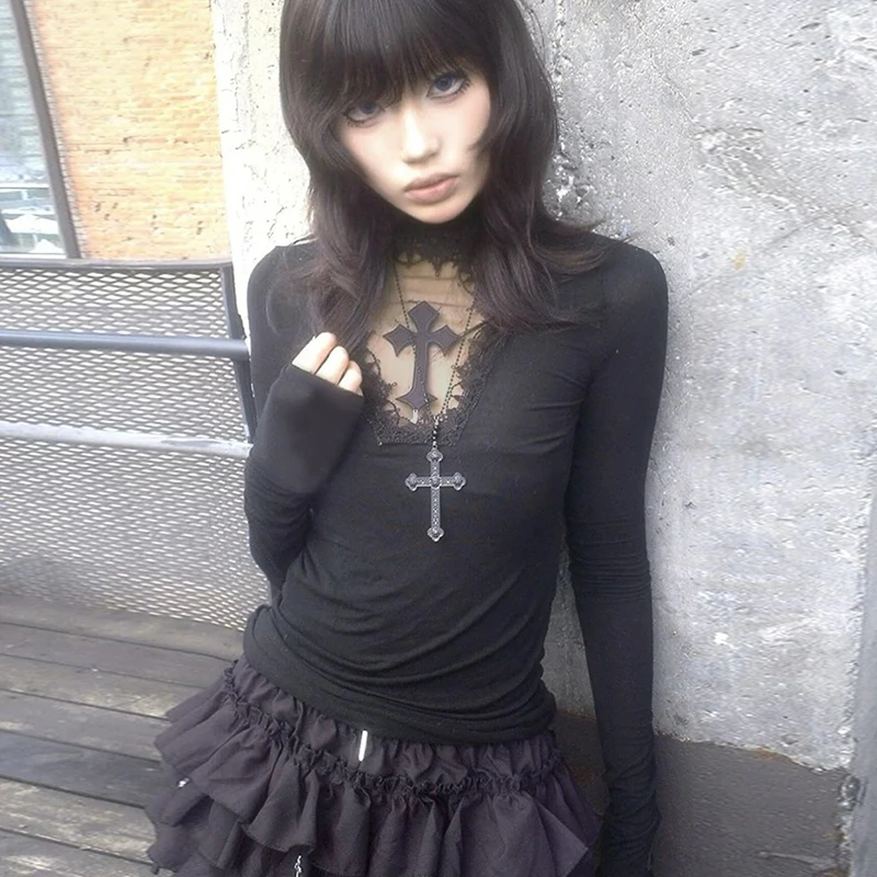 Highly Recommend Genayooa Y2k Gothic T Shirt Women Hollow Out Patchwork Vintage Crop Tops Streetwear American Retro Grunge Tops Aesthetic Tshirt