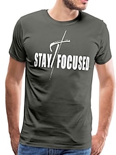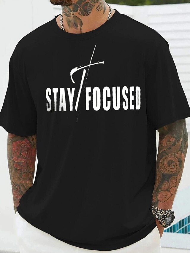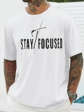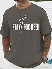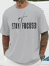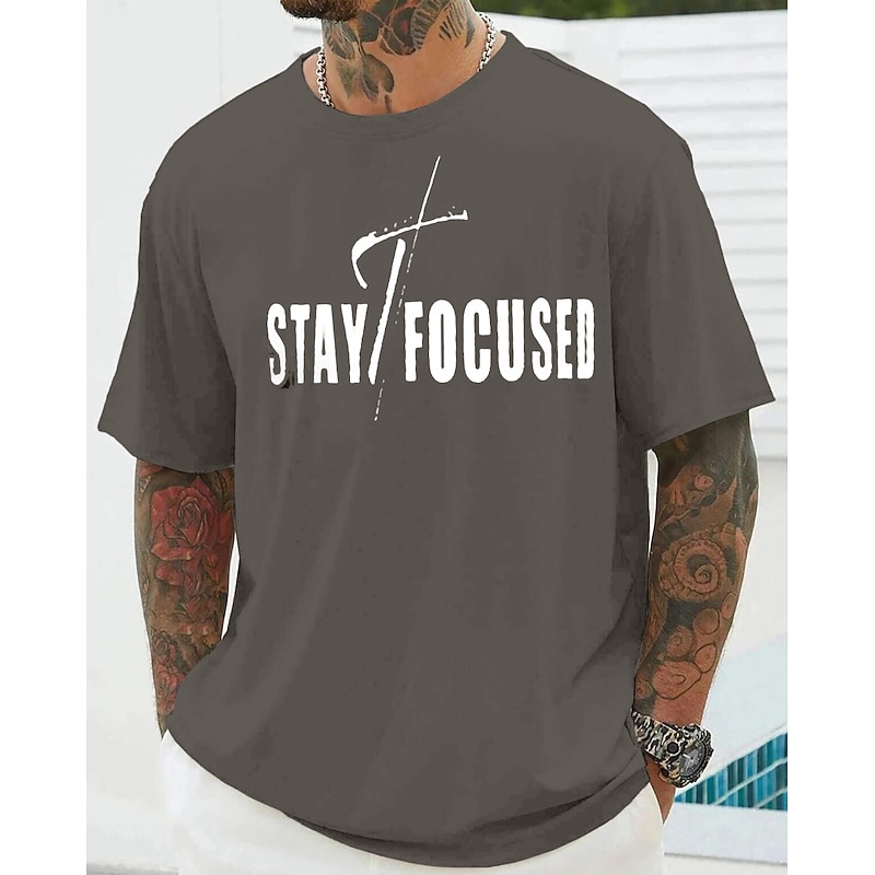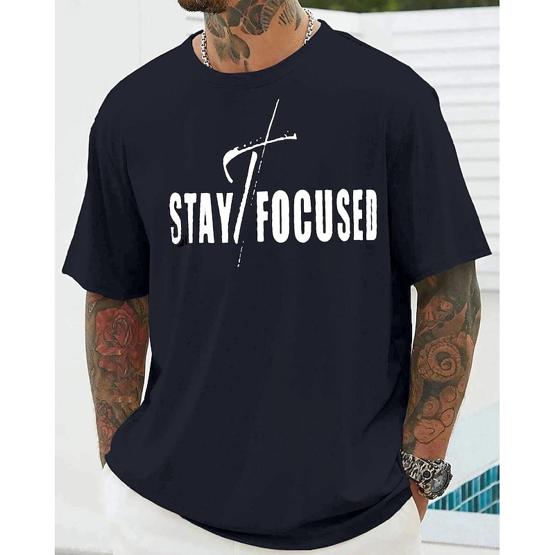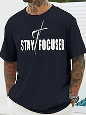 : Featuring a bold "STAY FOCUSED" graphic print on the front, this shirt makes a strong, motivational statement. Its minimalist aesthetic in classic colors such as green, white, black, dark gray, navy blue, and gray adds to its modern appeal. The straightforward design ensures it pairs seamlessly with various outfits, from casual to sporty.