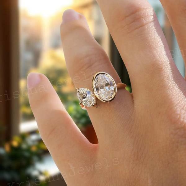 2 CT Oval Cut Moissanite Ring Bezel Set Wedding Ring Two Stone Engagement Ring 14k Yellow Gold Ring Toi Et Moi Ring Promise Ring For Her 6