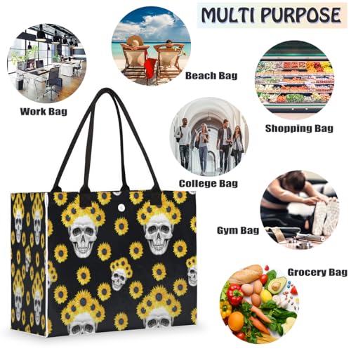 HOT ! Sunflower Wreath Skulls Tote Bag for Women Large 16.5x13x6.7 Inch Shoulder Bag with Zipper Pocket Felt Work Bag for Laptop Travel Shopping Beach Pool