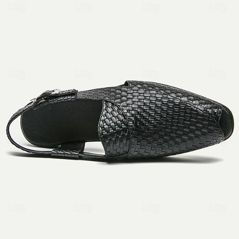 Men's Black Woven Leather Sandals - trendy Open-Toe Slingback Shoes with Buckle Strap