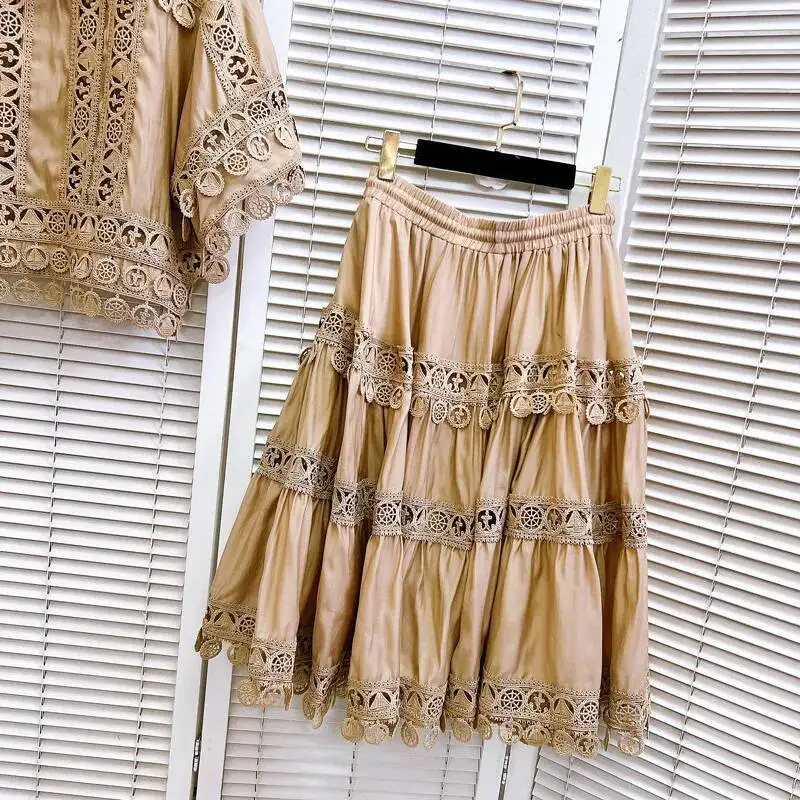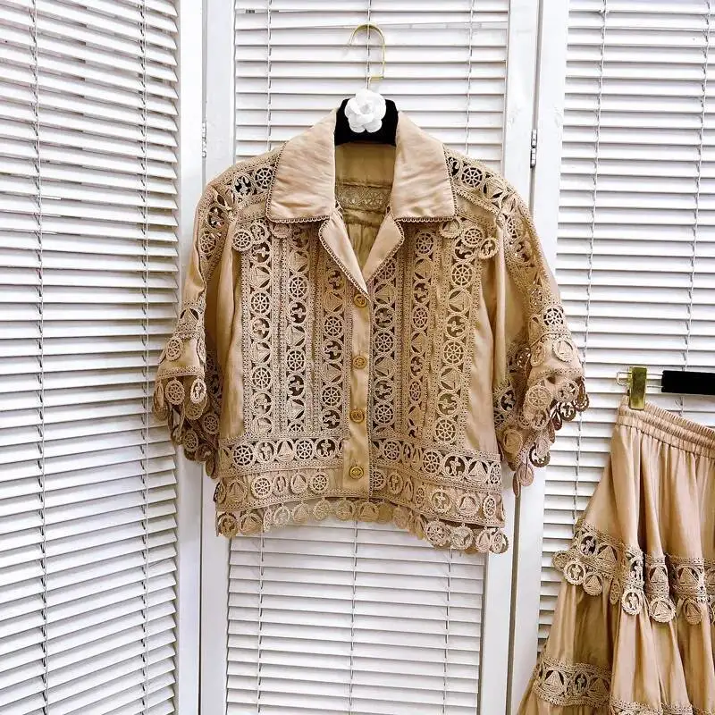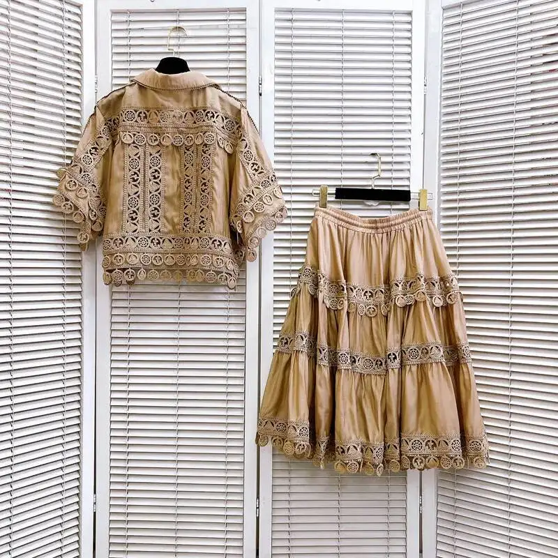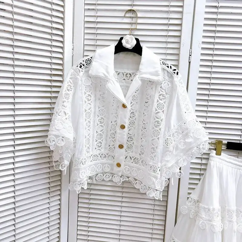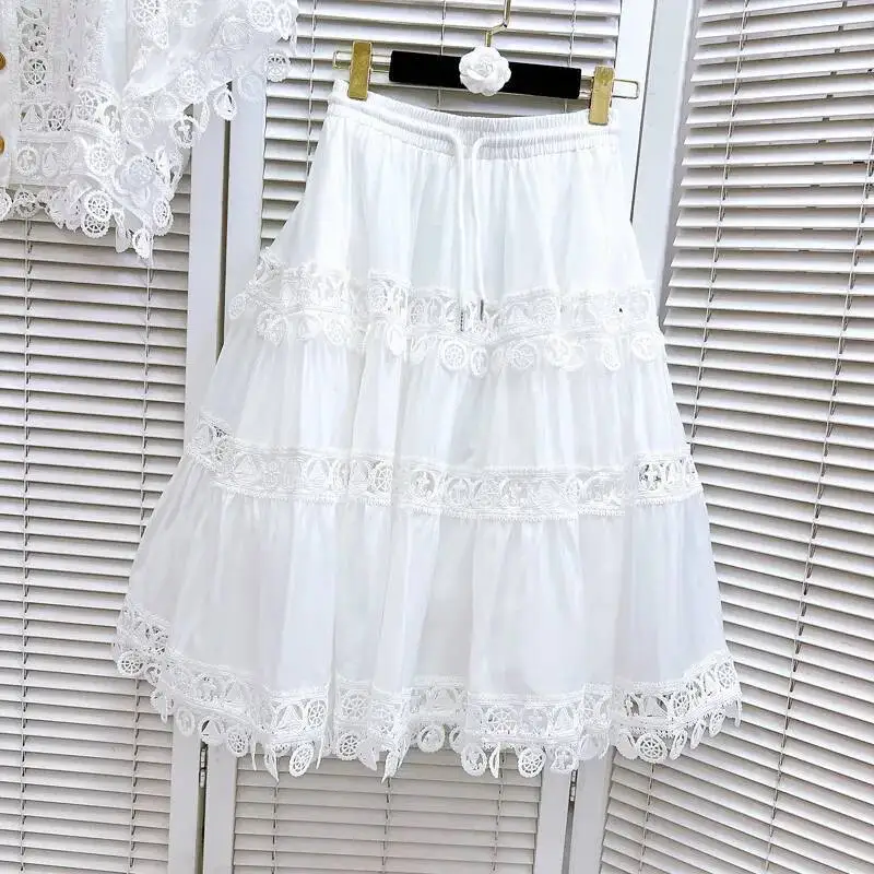 Luxury Hollow Out Dress Two Piece Set Women's 2025 Summer Holiday Embroidered Lace Jackets White Tops Pleated Short Skirts Suits