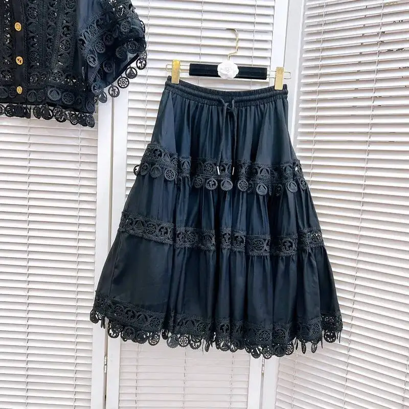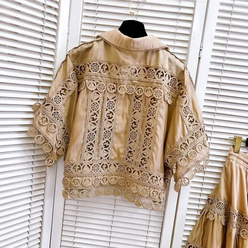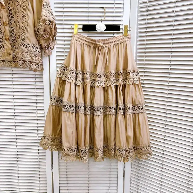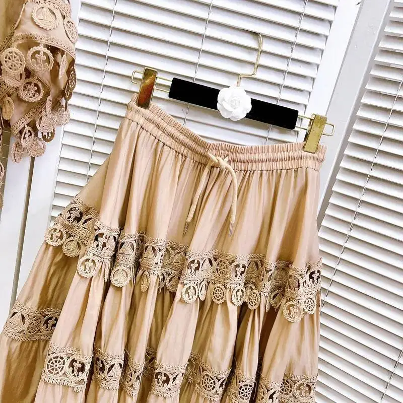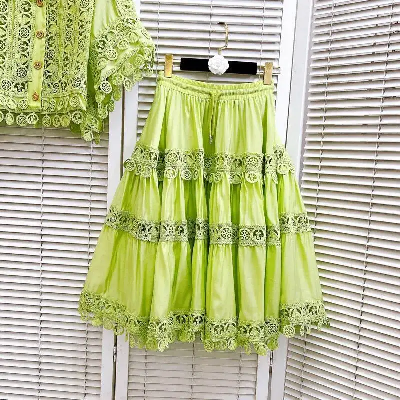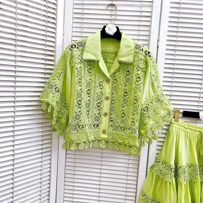 Luxury Hollow Out Dress Two Piece Set Women's 2025 Summer Holiday Embroidered Lace Jackets White Tops Pleated Short Skirts Suits