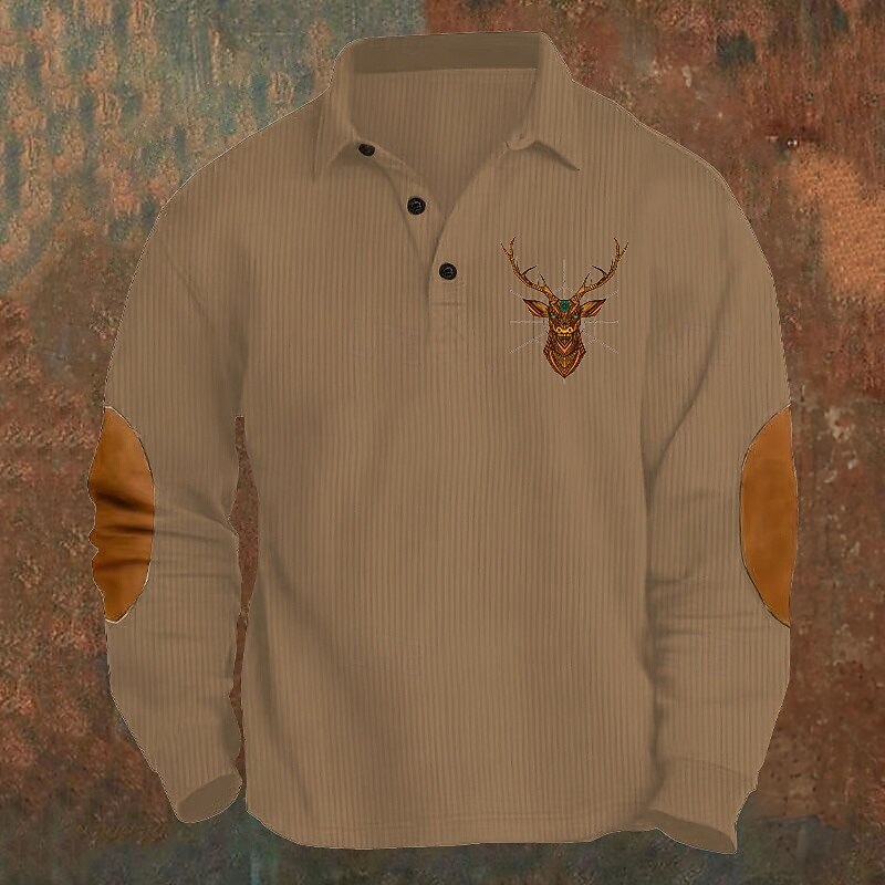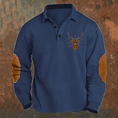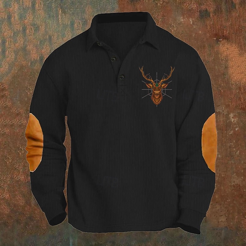 Highlights - High quality polyester fabric for durability and comfort - Long sleeves for added warmth - Stylish color block and reindeer pattern design - Unique patchwork and button details for a modern twist - Classic lapel neckline for a sophisticated look - Perfect for work or any formal occasion - Ideal for fashion-forward men