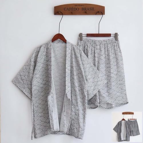ZEALMAX Men and Women's Japanese Kimono Pajamas Shirt and Shorts, Cotton Linen Loungewear Sleepwear Spa Bathrobe, Gray White 7