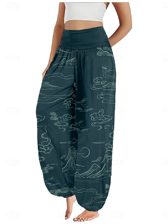 Women's Linen-Inspired Pants Wide Leg Pants Trousers Ethnic Style Casual Boho Full Length High Waist Floral Pocket Elastic Waist Printing Breathability Soft Micro-elastic Outdoor Yoga Forest Green 18