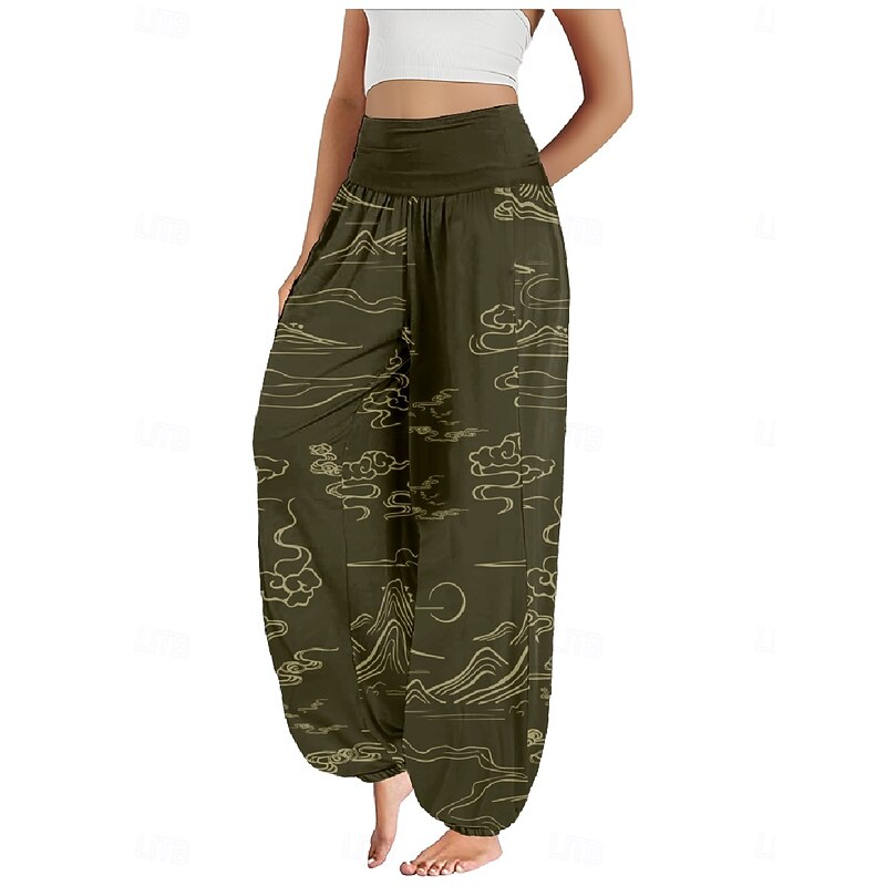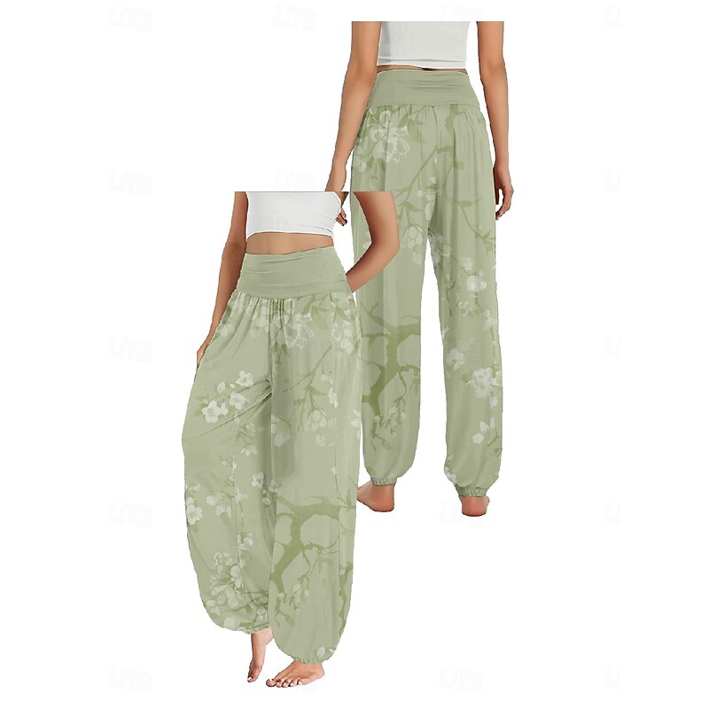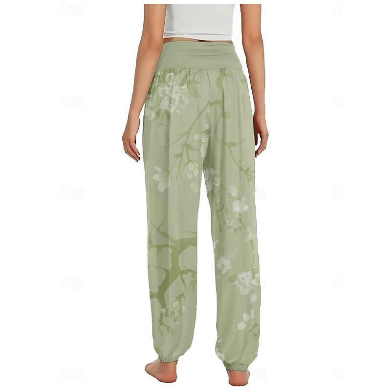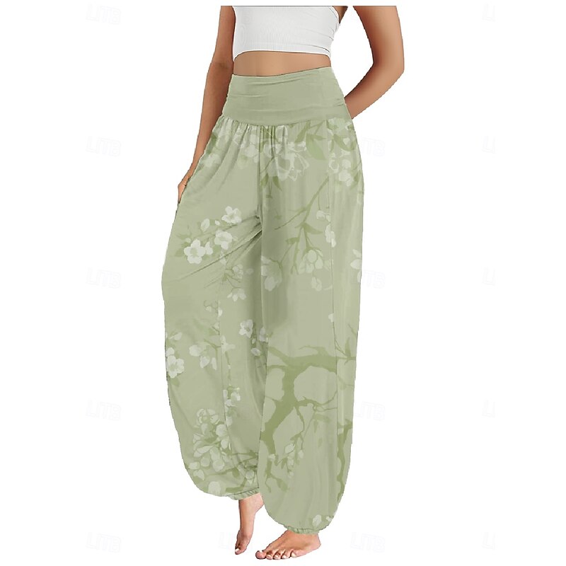 Women's Linen-Inspired Pants Wide Leg Pants Trousers Ethnic Style Casual Boho Full Length High Waist Floral Pocket Elastic Waist Printing Breathability Soft Micro-elastic Outdoor Yoga Forest Green 9