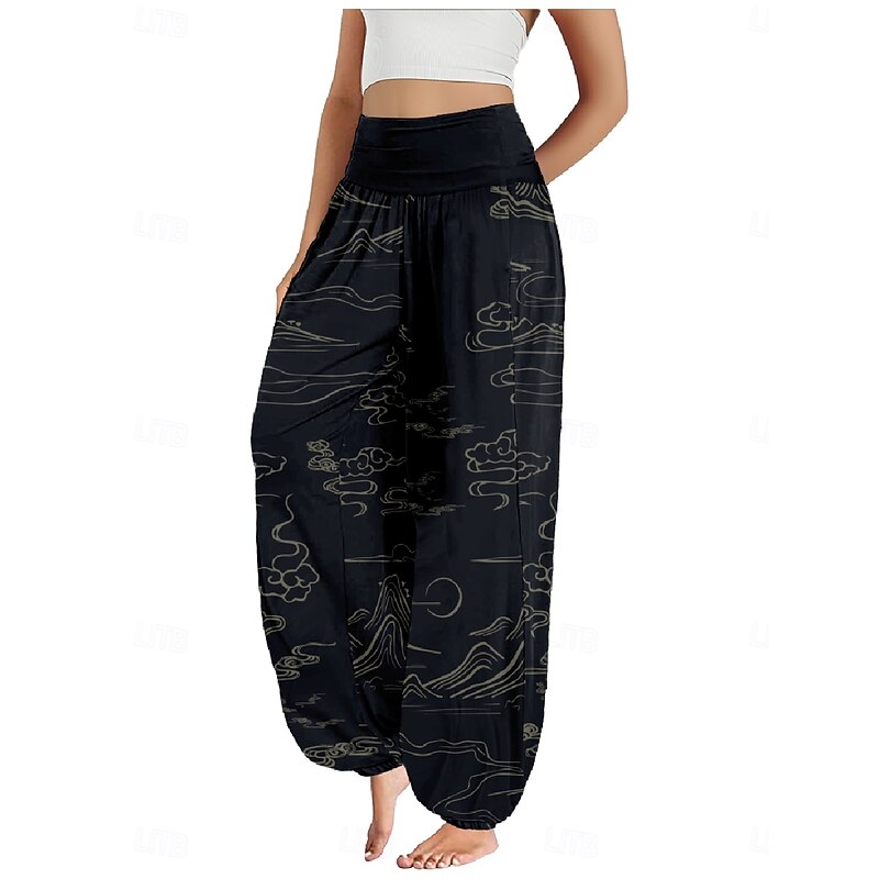 Women's Linen-Inspired Pants Wide Leg Pants Trousers Ethnic Style Casual Boho Full Length High Waist Floral Pocket Elastic Waist Printing Breathability Soft Micro-elastic Outdoor Yoga Forest Green 23