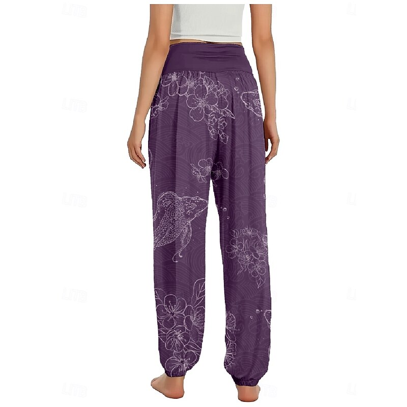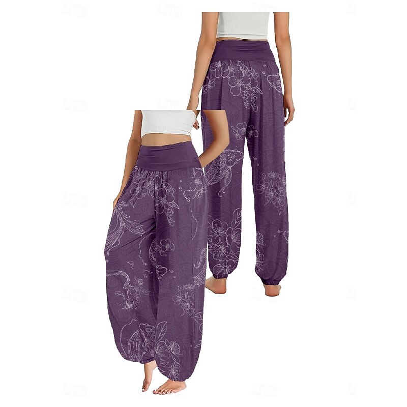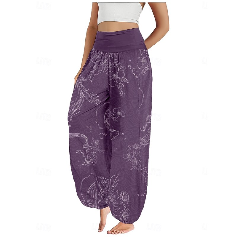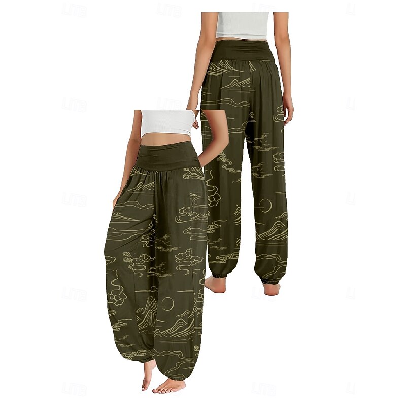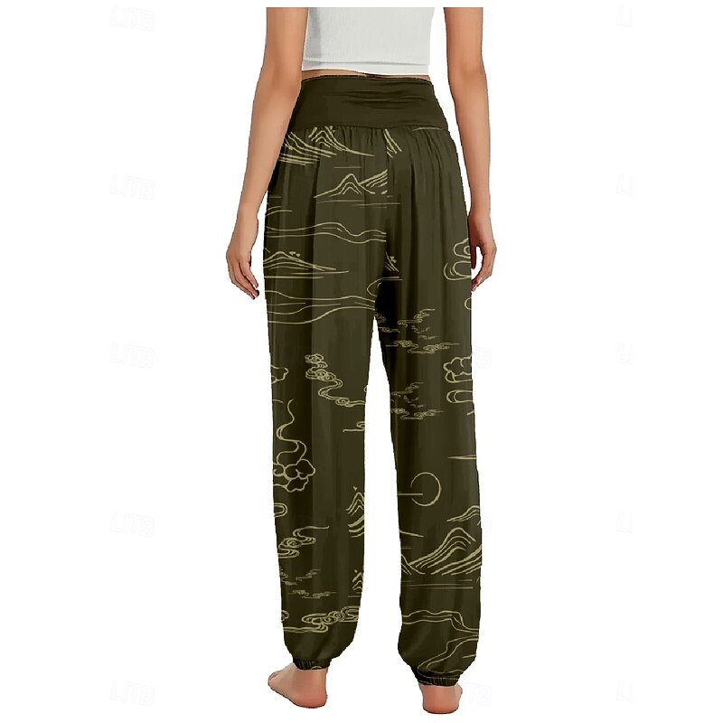 Women's Linen-Inspired Pants Wide Leg Pants Trousers Ethnic Style Casual Boho Full Length High Waist Floral Pocket Elastic Waist Printing Breathability Soft Micro-elastic Outdoor Yoga Forest Green 17