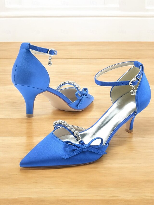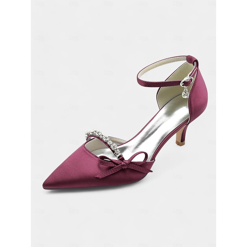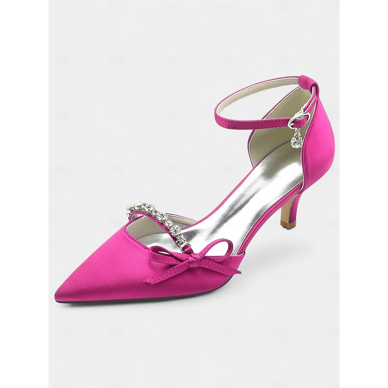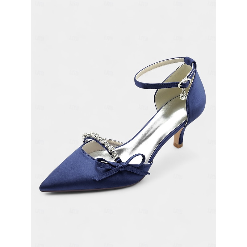 HOT ! Pointed-Toe Kitten Heel Wedding Shoes for Women – Elegant Ankle Strap Bridal Heels with Rhinestone and Bow Detail