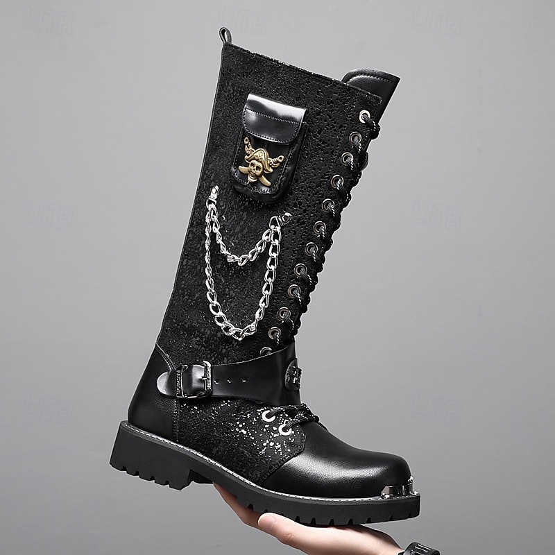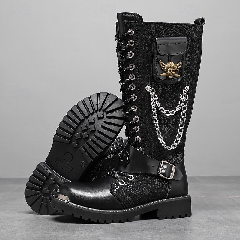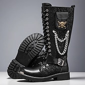 HOT ! Men's Black Punk Gothic Boots Tall Lace-Up Combat Boots with Skull and Metal Chain Details for Halloween Parties, Horror Cosplay and Themed Festivals