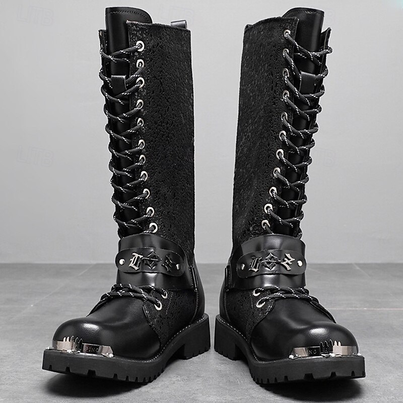 Men's Black Punk Gothic Boots Tall Lace-Up Combat Boots with Skull and Metal Chain Details for Halloween Parties, Horror Cosplay and Themed Festivals 1