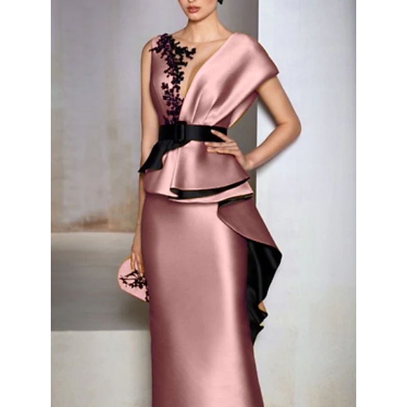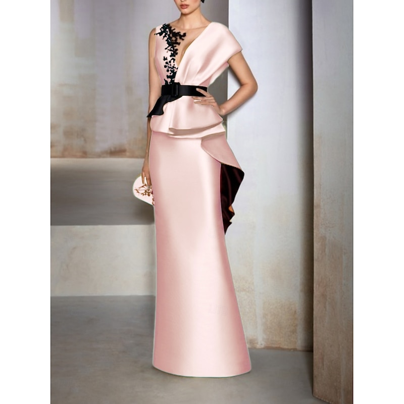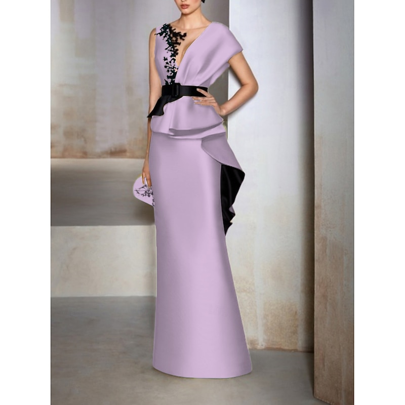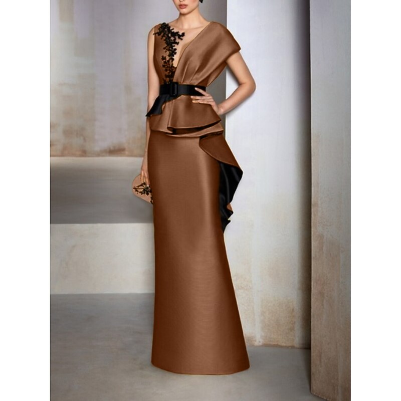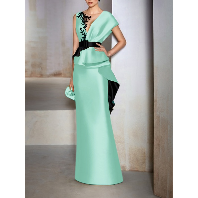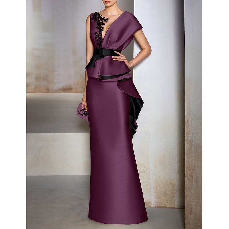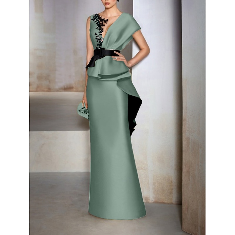HOT ! Sheath Mother of the Bride Evening Gown Elegant Dress Formal Wedding Guest Floor Length Short Sleeve V Neck Satin with Ruffles Embroidery Appliques