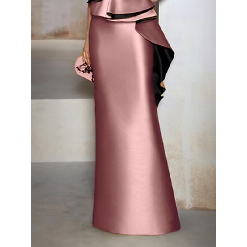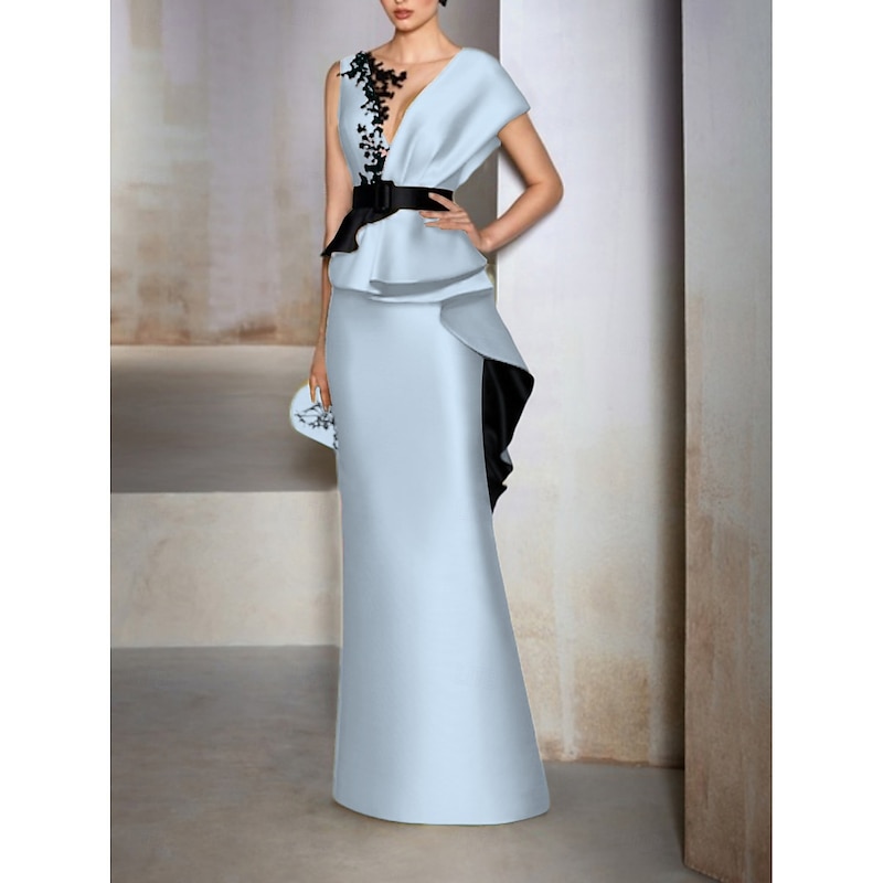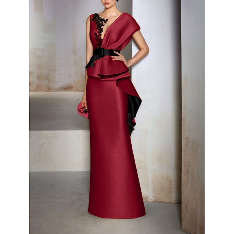 Sheath Mother of the Bride Evening Gown Elegant Dress Formal Wedding Guest Floor Length Short Sleeve V Neck Satin with Ruffles Embroidery Appliques 1