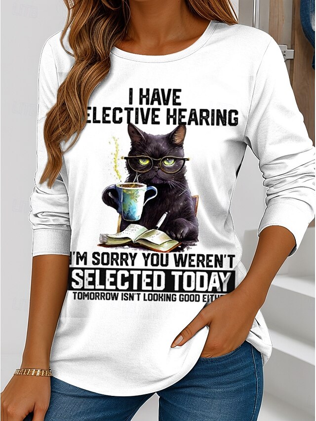 HOT ! Women's T shirt Crew Neck Long Sleeve Tunic Graphic Cat Letter Vintage Stylish Classic Round Neck Regular Tops Daily Weekend Print White / Black Black White Pink Green Spring Fall