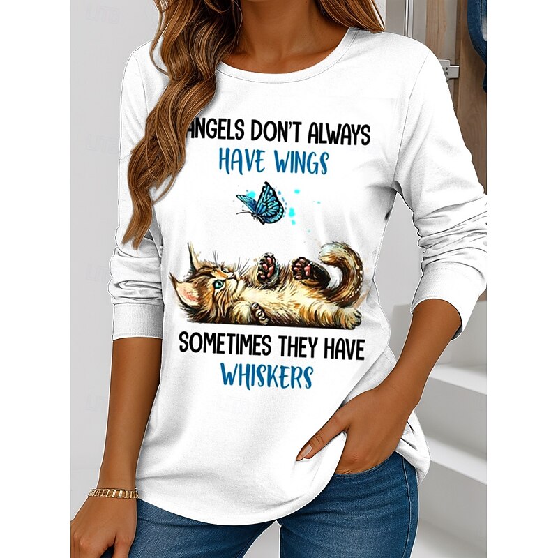 Women's T shirt Crew Neck Long Sleeve Tunic Graphic Cat Letter Vintage Stylish Classic  Round Neck Regular Tops Daily Weekend Print White / Black Black White Pink Green Spring Fall 12