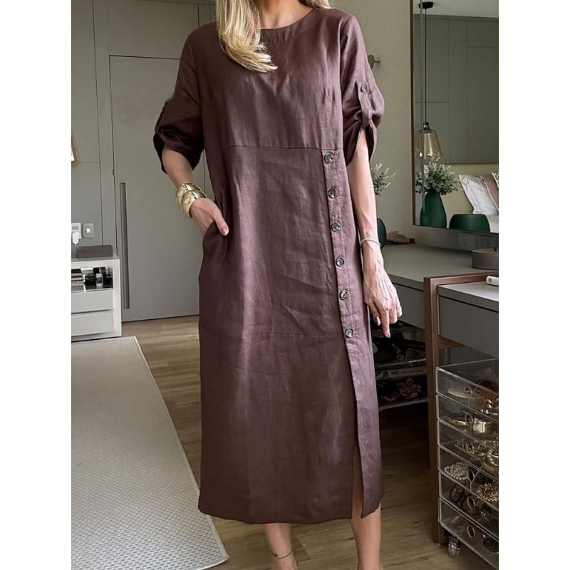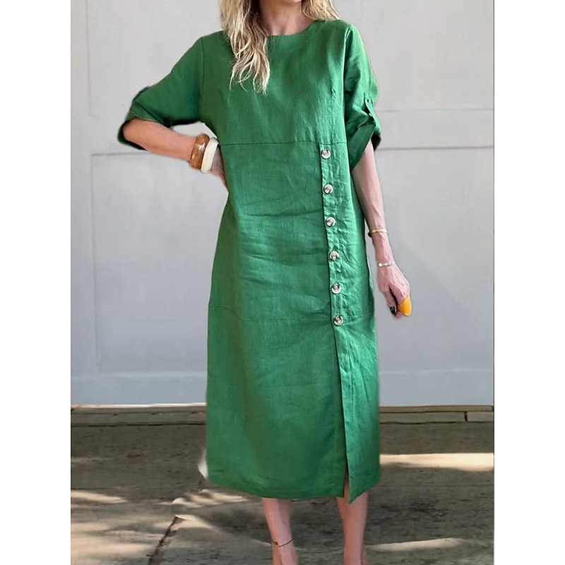 Highlights - Perfect for all seasons: Spring, Summer, and Fall - Made with high-quality Cotton and Linen fabric - Designed for women's daily wear - Basic style with a casual dress type - Features stylish button details - Comfortable crew neck neckline - Elegant midi dress length style