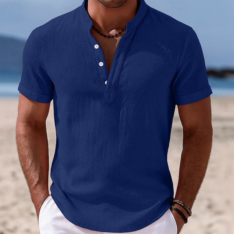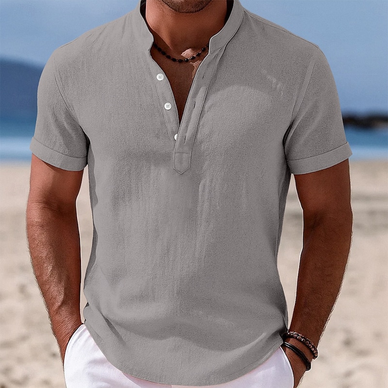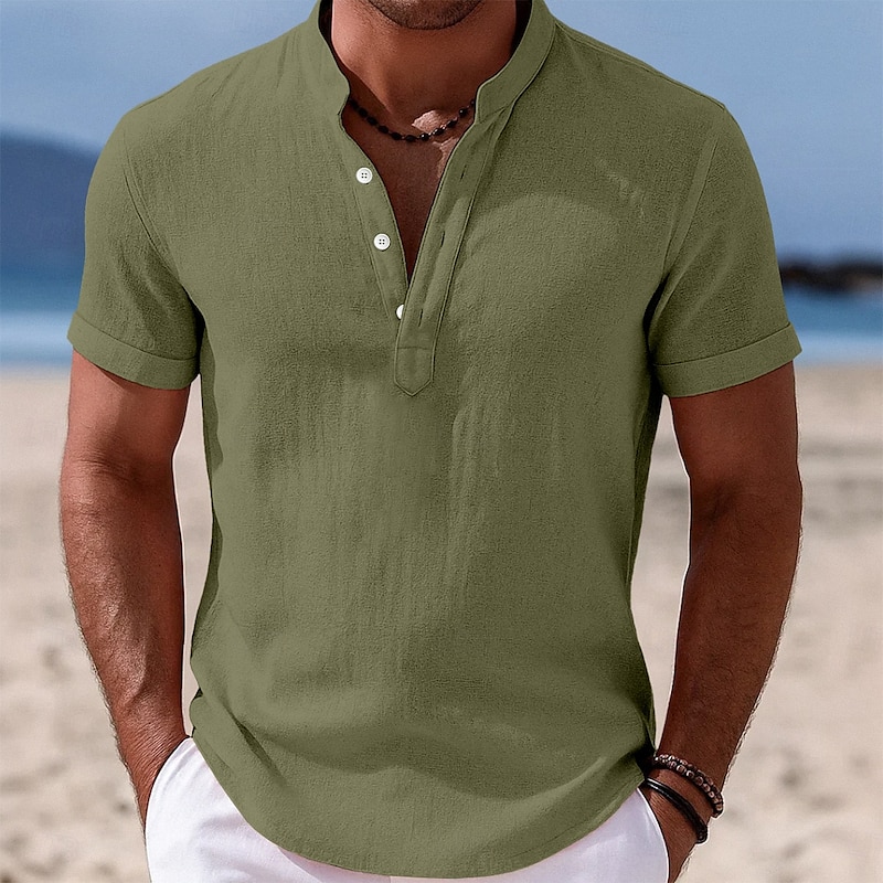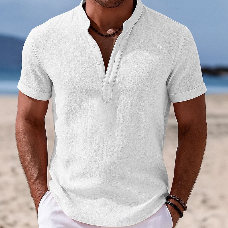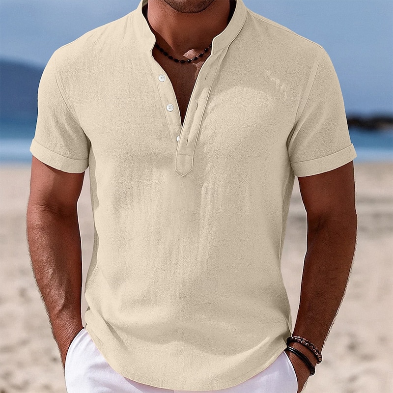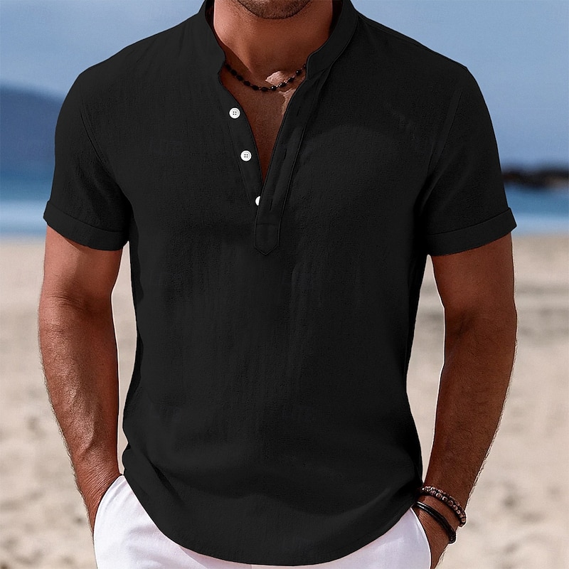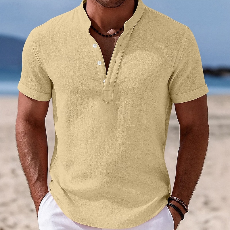 More information about Men's Shirt Linen Shirt Popover Shirt Summer Shirt Beach Wear Band Collar Shirt Plain Vacation Casual Black White Yellow Pink Short Sleeve Stand Collar Summer Clothing Apparel