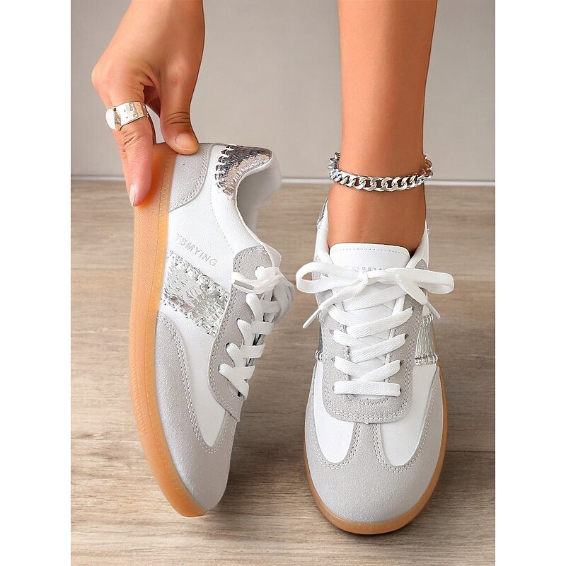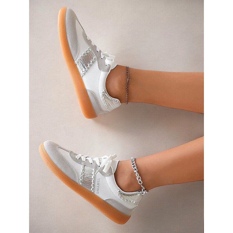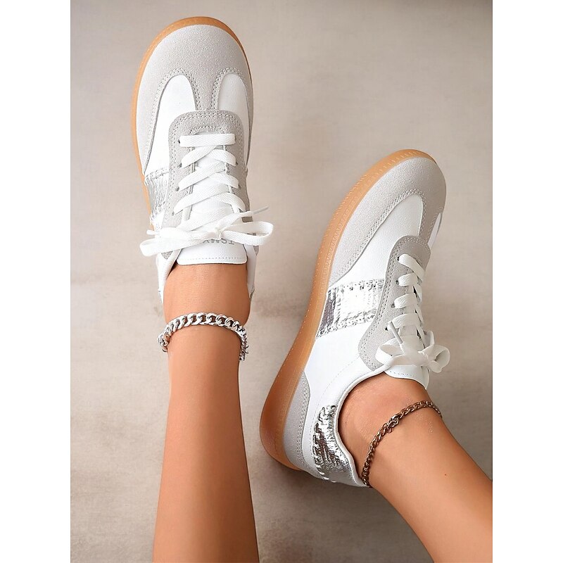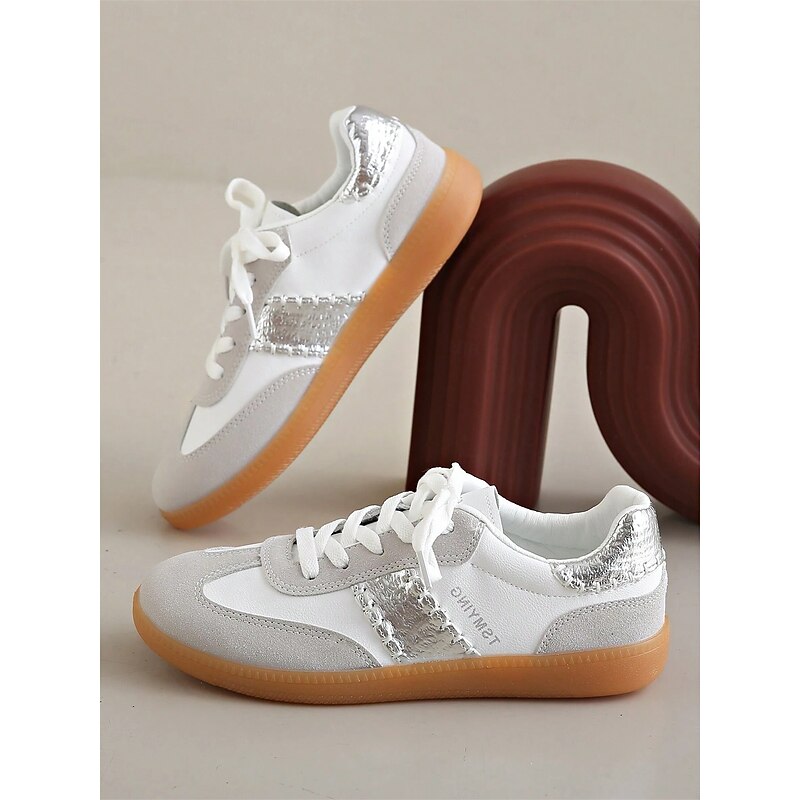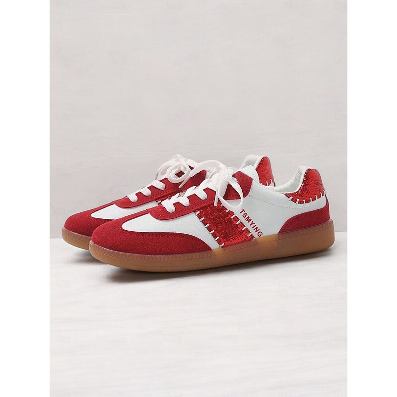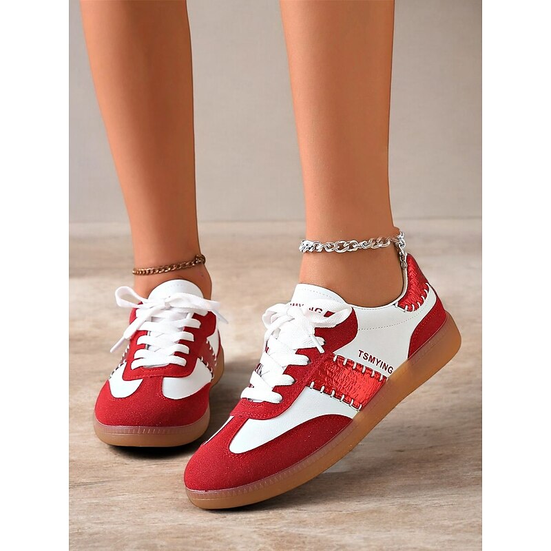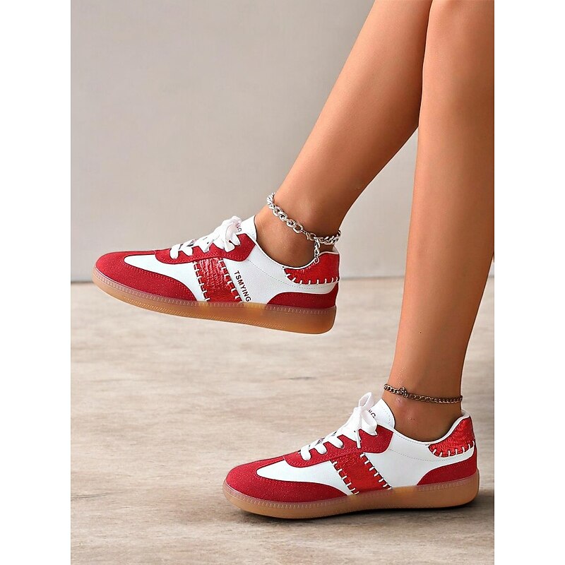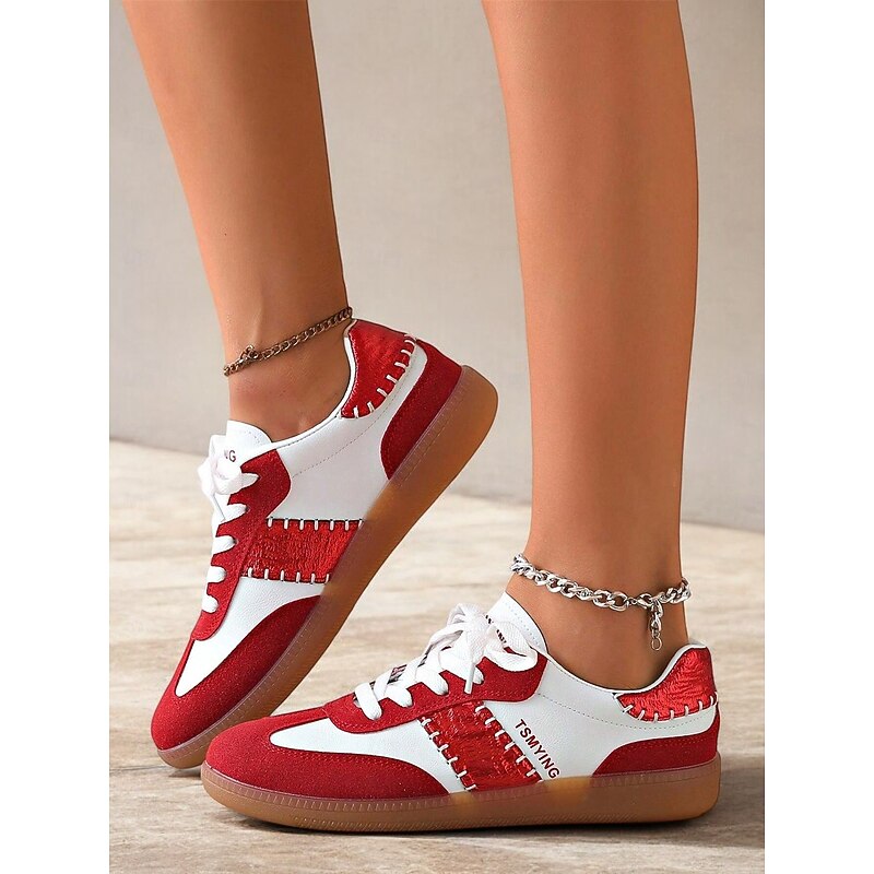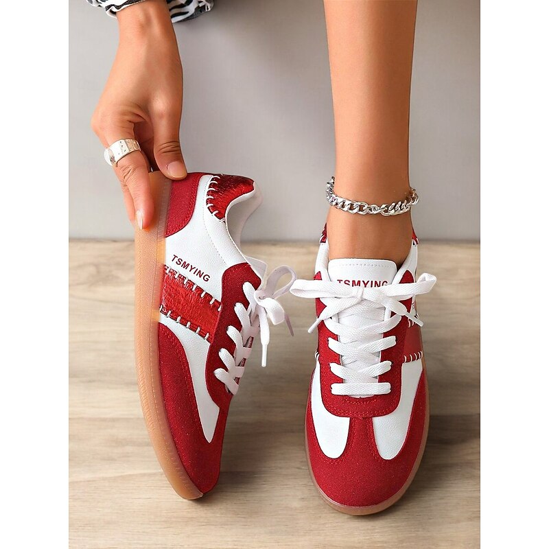 Highlights [Fabric] Crafted from a blend of faux leather and suede, these women's sneakers are designed for both durability and elegance. The rubber outsole ensures excellent grip and wear resistance, making them a perfect blend of style and practicality. [Style & Fit] Featuring a classic low-top, flat heel design, these sneakers incorporate a lace-up closure for a secure and comfortable fit. The round toe shape and minimalistic style provide a timeless look that suits various occasions. [Design Highlights] The sneakers showcase a striking contrast color pattern, combining black, gray, and red panels for a modern and eye-catching appearance. The lace-up design not only offers functionality but also adds a touch of sporty elegance. [Occasions] Ideal for daily wear, these sneakers are versatile enough for casual outings and even light sports activities. Their comfortable fit makes them a great choice for different settings, ensuring you stay stylish while on the go. [Size Range] Available in various sizes to accommodate different foot measurements, ensuring a perfect fit for every wearer. Sizes range from US5.5 to US10.5, offering options for a wide spectrum of customers.
