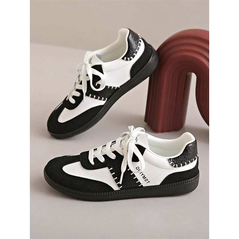 HOT ! Women's Retro Black and White Lace-Up Sneakers - Casual Low-Top Design with Suede and Fabric Accents, Comfortable Sole for Daily Wear and Sports Activities