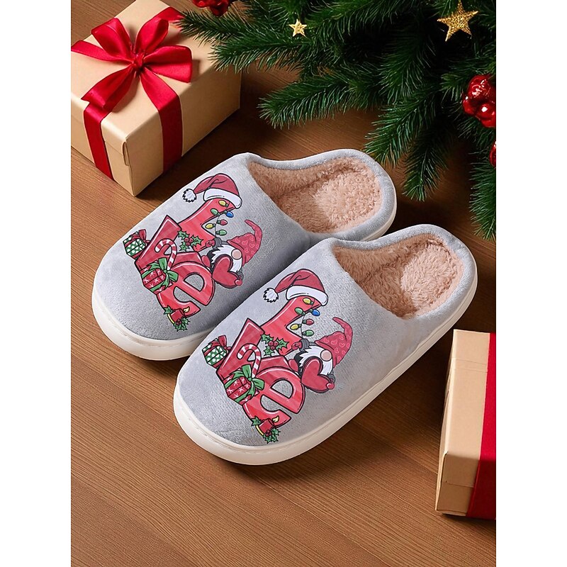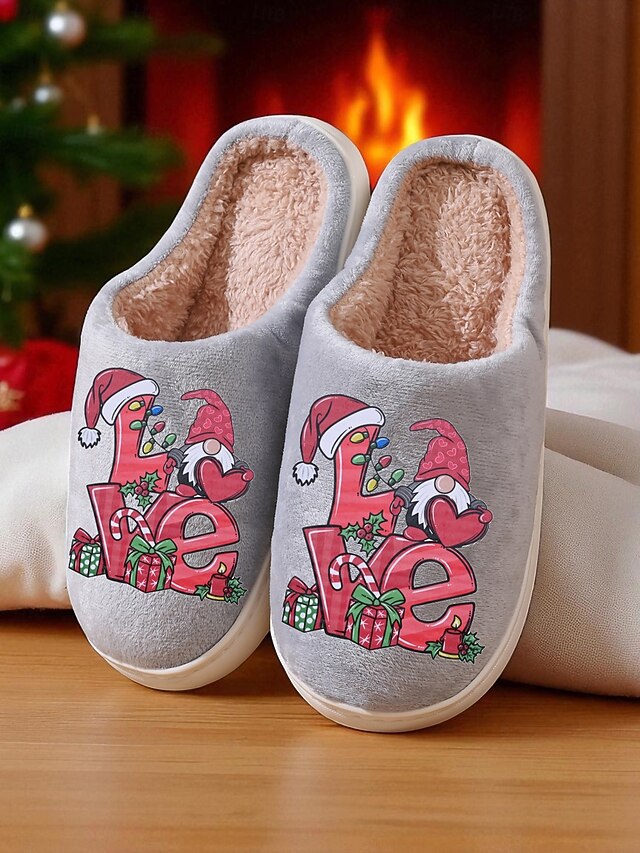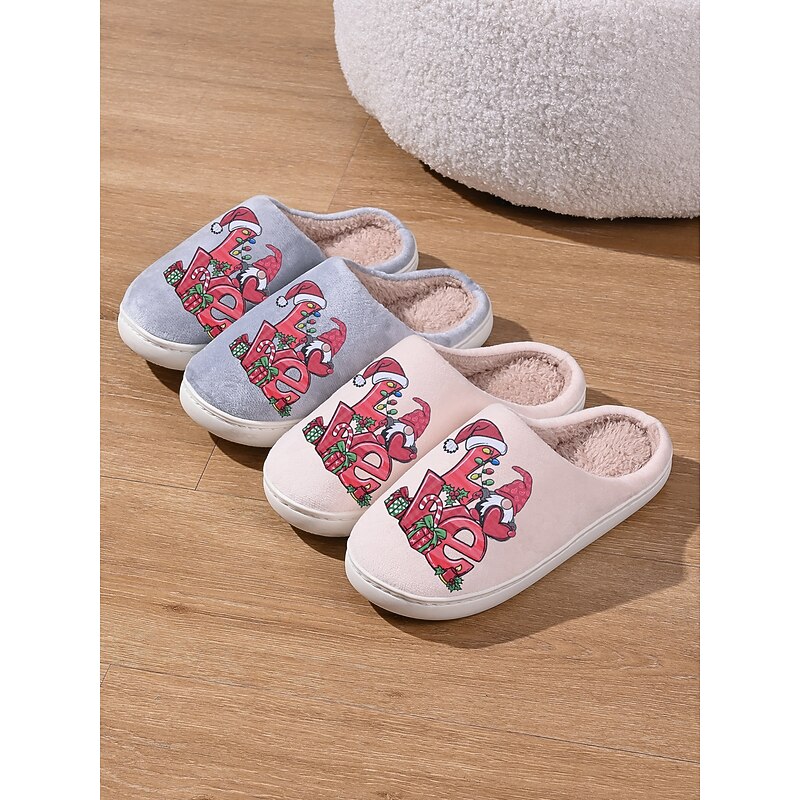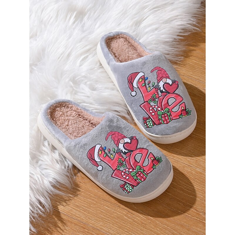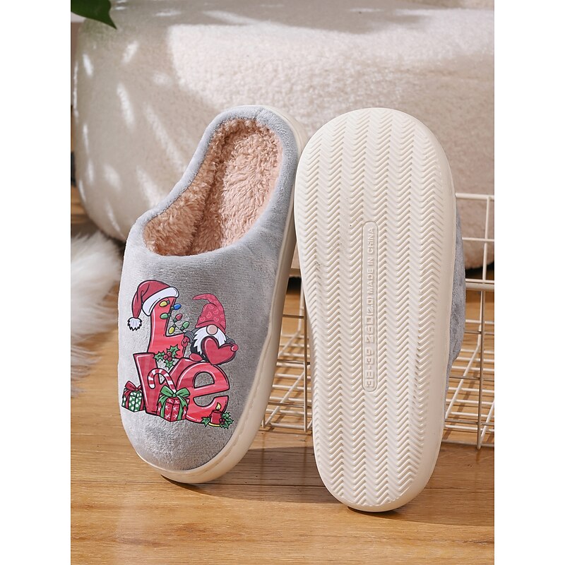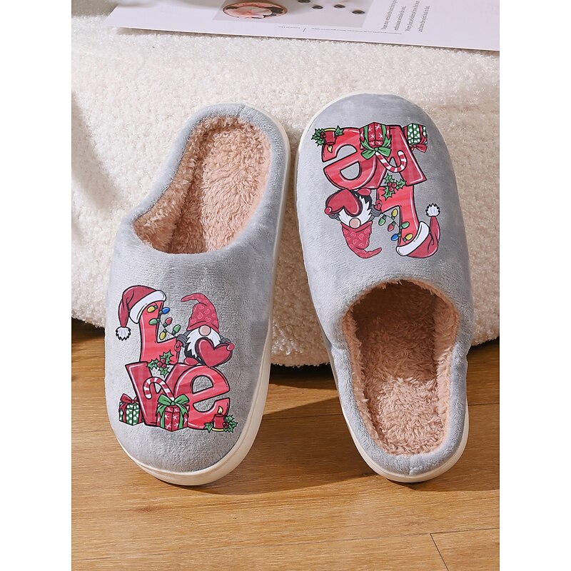HOT ! Women's Beige Christmas Slippers with Plush Lining and Festive Love Print – Cozy Indoor Winter Shoes for Holiday, Home and Gift Giving