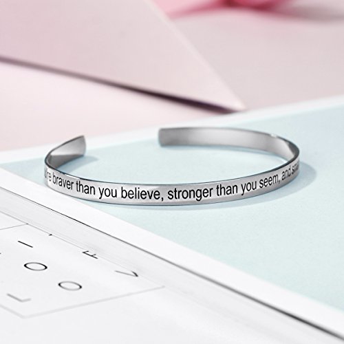 • >>> INSPIRATIONAL CUFF BRACELET - Slender sterling silver cuff bracelet with engraved message “You're braver than you believe, stronger than you seem, and smarter than you think”. More importantly, you can CUSTOMIZE any inscriptions you want to engrave.