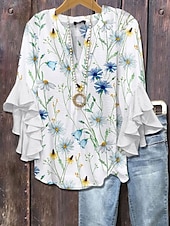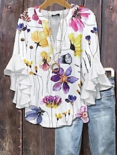 More information about Women's Blouse V Neck Layered Ruffle Sleeve Tops Floral Graphic Vintage Daily Ethnic 3/4 Length Sleeve Regular Tops Daily Holiday Vacation Wear Print Pink Blue Purple Summer Spring