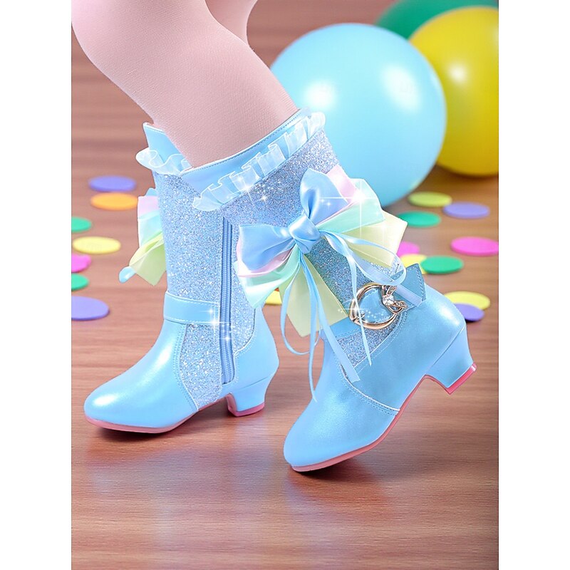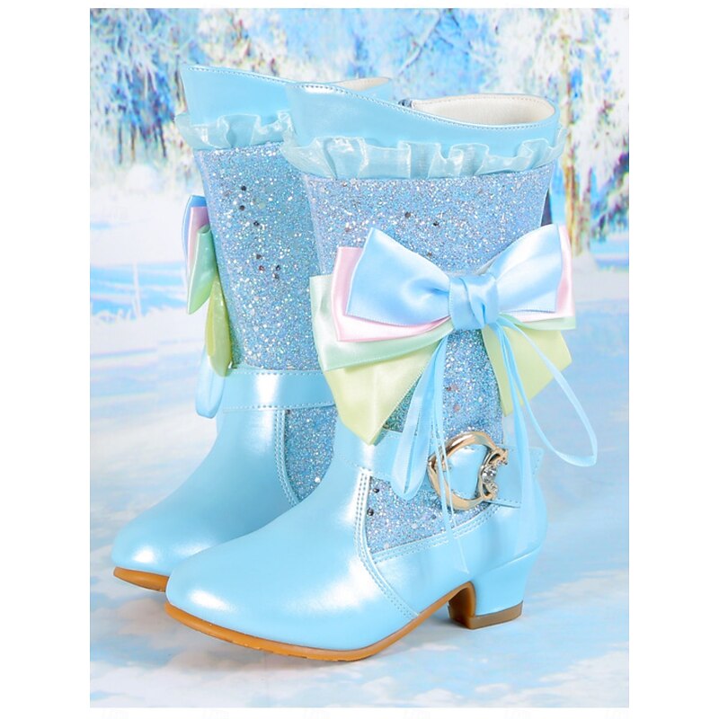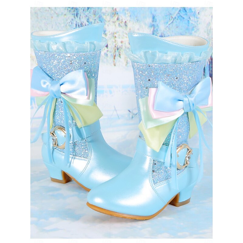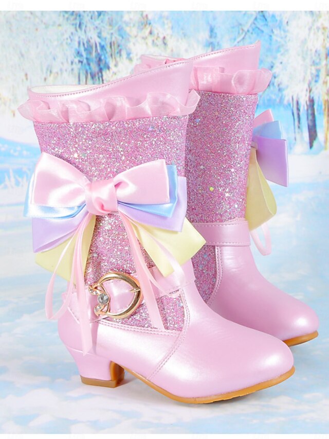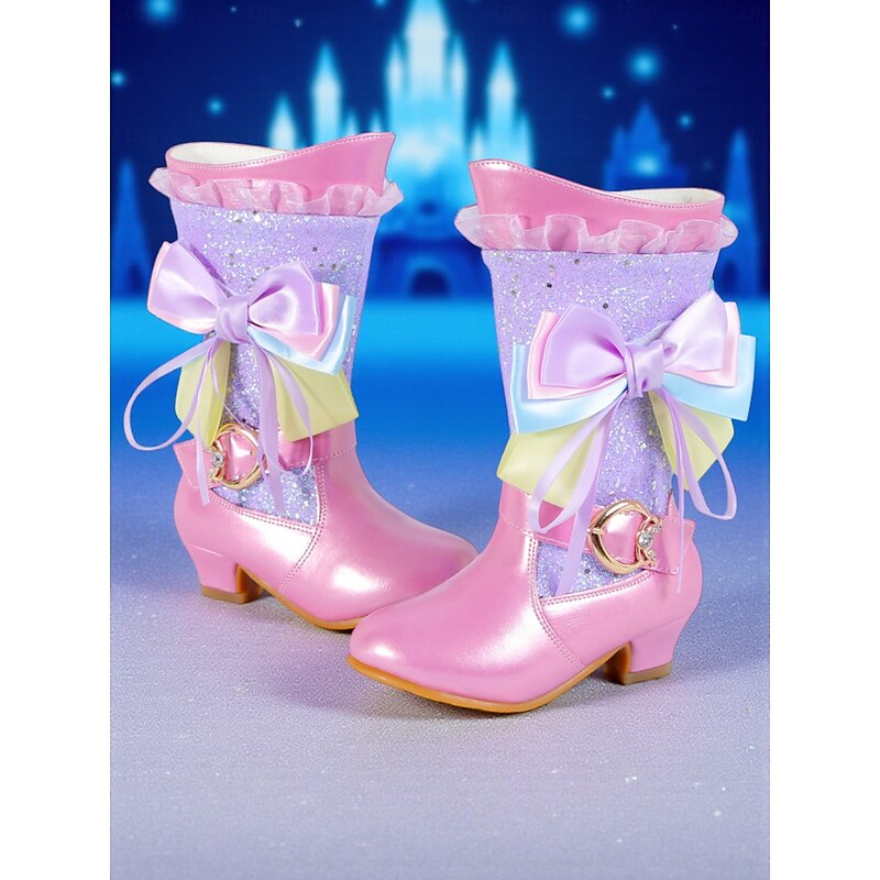 HOT ! Girl's Pink Glitter Bow Boots -Sparkly Mid-Calf Princess Shoes with Ruffle Trim for Parties, Cosplay, and Dress-Up