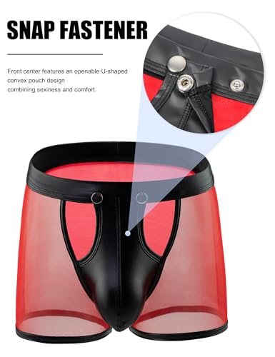 ohmydear Men Sexy Boxer Briefs See Through Mesh Underwear Funny Button Faux Leather Removable Pouch Breathable Underpants 5