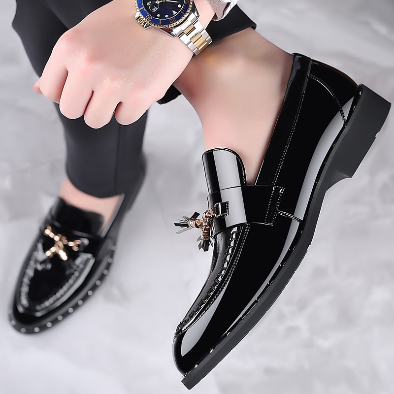 HOT ! Men's Black Patent Leather Loafers with Tassel Details - Stylish Formal Dress Shoes for Office and Events
