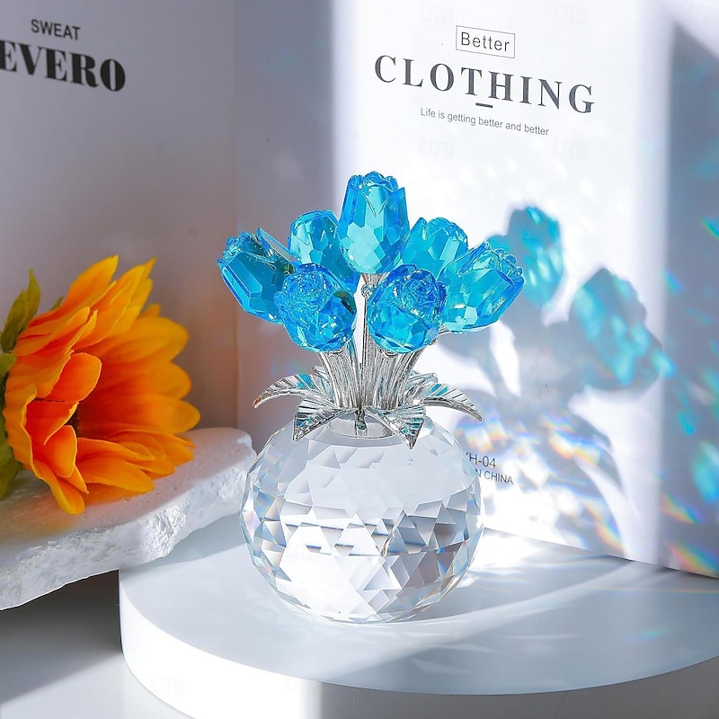 Handmade Crystal Champagne Rose Flower Figurine with Round Vase Romantic Rose Gifts for Women on Wedding Valentine's Chrismas Glass Rose Flowers for Girlfriend Wife Home Table Decorations 29