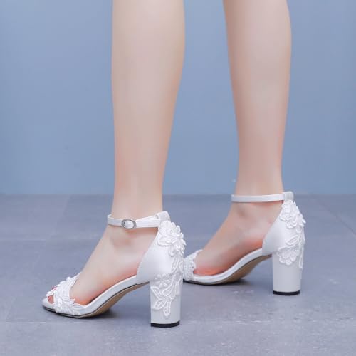 White Bridal Shoes Open Toe Mid Block Heel Sandals Lace Flower Satin Ankle Strap Comfortable Wedding Dress Shoes Sandals Women Chunky Heel Sandals 6