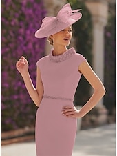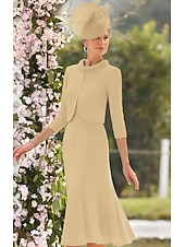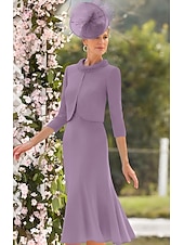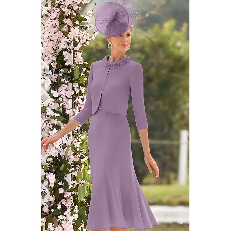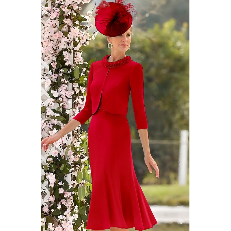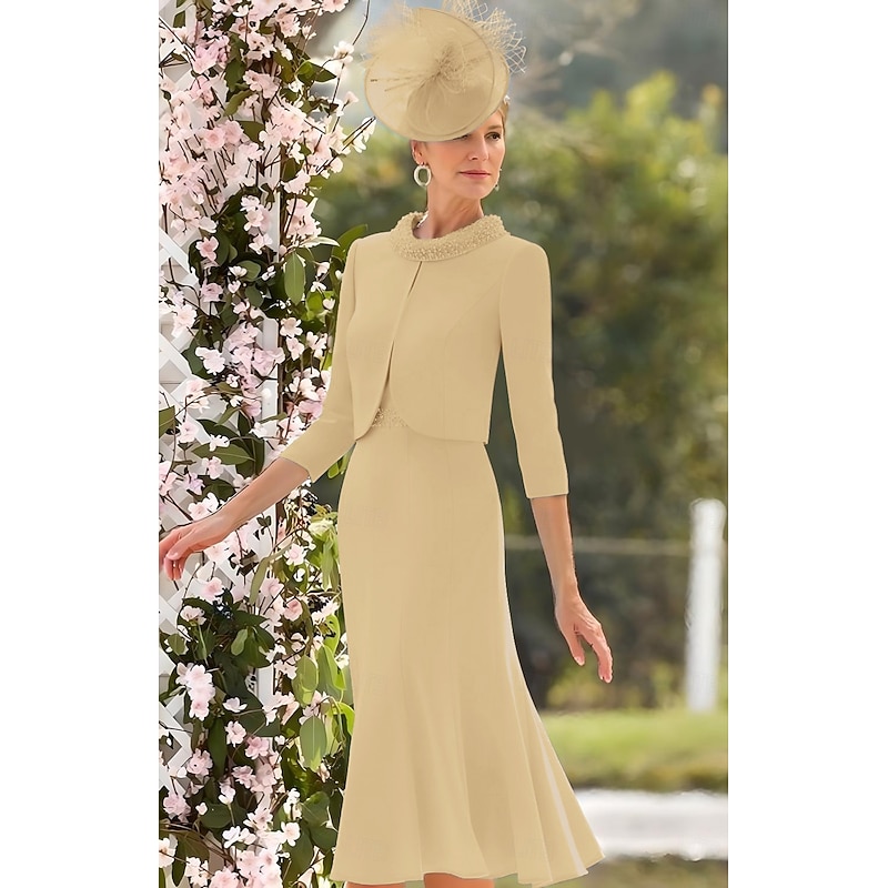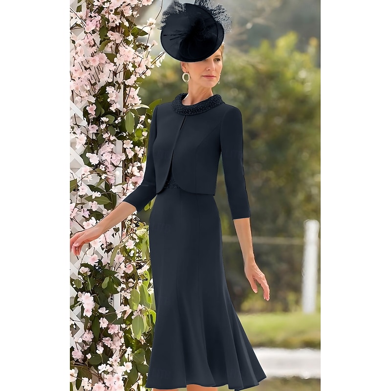More information about Dress Sets Mother of the Bride Formal Wedding Guest Elegant Vintage Jewel Neck Tea Length Stretch Fabric 3/4 Length Sleeve with Lace Pearls Race Day Dress