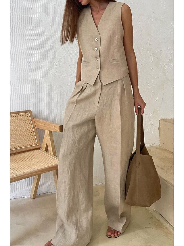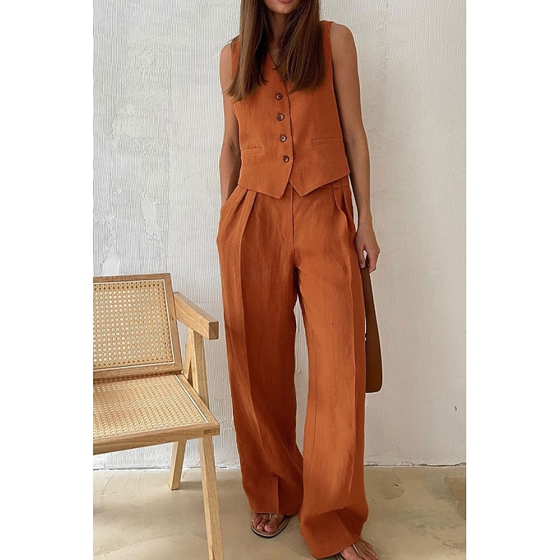 HOT ! Women's Active Fashion Blouse Pants Sets Sleeveless V Neck Solid Color Dubbele Rij Knopen Vacation Casual Daily Black Orange Khaki Summer Regular Fit