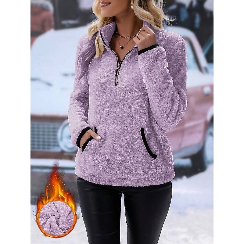HOT ! Women's Sweatshirt Casual Fleece Street Dailywear High Neck Zipper Pocket Long Sleeve White Wine Blue Purple Fall Winter