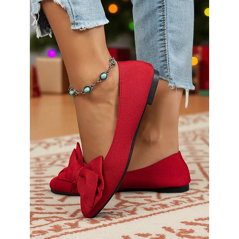 HOT ! Women's Red Bow Flat Shoes – Elegant Slip On Ballet Flats for Christmas Parties, Weddings and Daily Wear