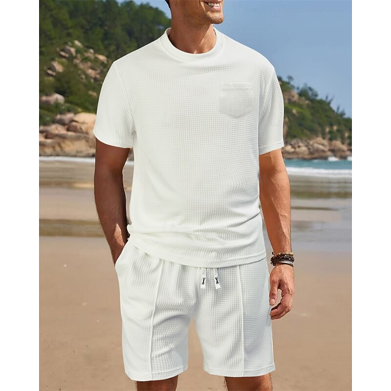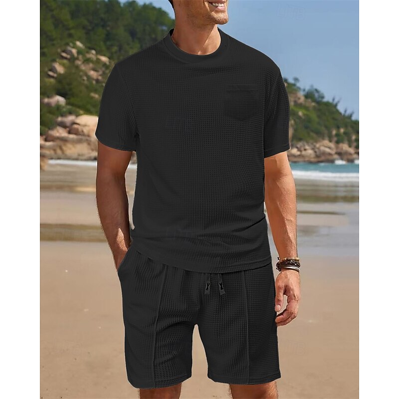 Why Choose Men's Waffle Shirt T-shirt Suits 2 Pieces Outfits Tee & Shorts Short Sleeve Crew Neck Summer Plain Fashion Casual Pocket 2 Piece Vacation Daily Wear Going out Black White Wine Top Tee for Men?