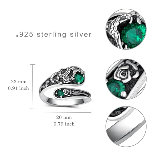 • About This Ring: The detailed sterling silver metalwork features delicate floral patterns and scales that elegantly wrap around your finger. The detailed scaling and textured finish create a striking vintage look. The contrast between the dark oxidized silver and the vibrant green stones makes this piece a captivating accessory that's perfect for those who appreciate unique, nature-inspired jewelry.