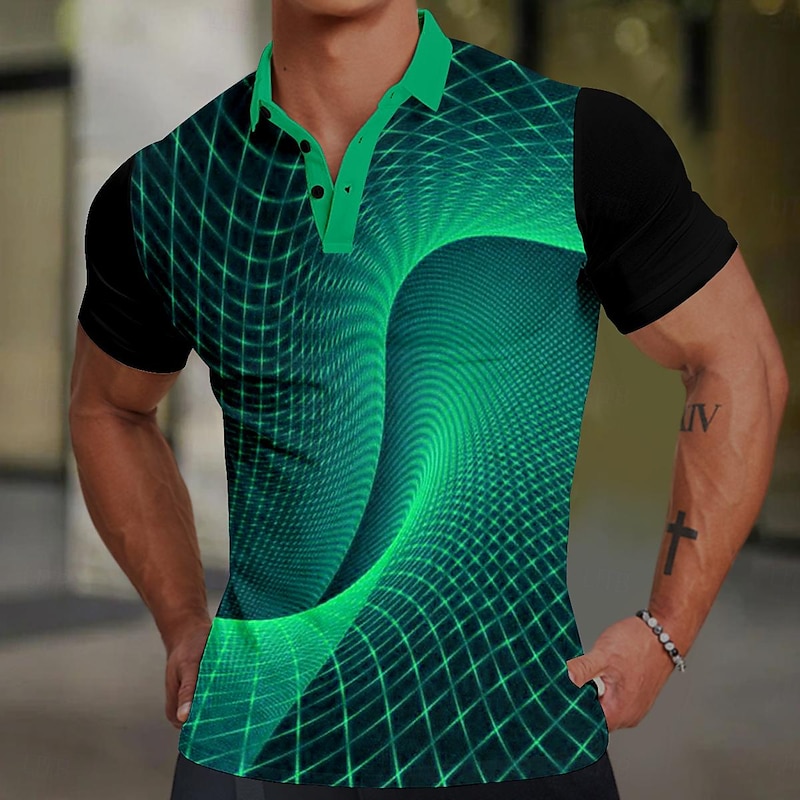 Highlights [Fabric] Expertly crafted from a premium blend of polyester and waffle fabric, this men's polo shirt offers breathability and comfort, perfect for keeping cool during spring and summer. The unique fabric blend ensures durability and a soft feel against the skin. [Fit] The shirt features a slim fit design that contours to the body, highlighting a modern silhouette while providing the flexibility needed for both casual outings and sporting activities. [Design Highlights] Adorned with a striking 3D graphic print, this polo shirt boasts a captivating geometric pattern in vibrant blue, green, and gray hues. The contrasting black short sleeves and solid blue collar and placket add a sophisticated touch, while the button-down front maintains its classic polo aesthetic. [Occasions] Ideal for a variety of events, this polo shirt seamlessly transitions from vacation wear to rave or party outfits. Its stylish appeal makes it suitable for both relaxed gatherings and more vibrant celebrations. [Size Range] Available in a wide range of sizes from S to XXXL, this shirt caters to various body types, ensuring a comfortable fit for all adults.