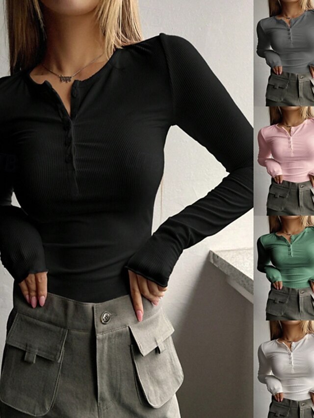 Women's Blouse Solid Color Stylish Basic Casual Long Sleeve Crew Neck Regular Tops Daily Buttons Black White Pink Green Gray Summer Spring Fall 15