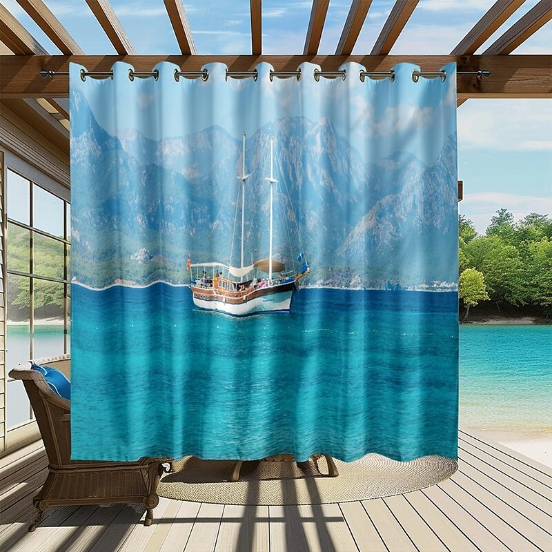 HOT ! Waterproof Outdoor Curtain Privacy, Sliding Patio Curtain Drapes, Pergola Curtains Grommet 3D Ocean Boat Landscape For Gazebo, Balcony, Porch, Party, 1 Panel