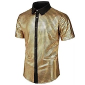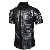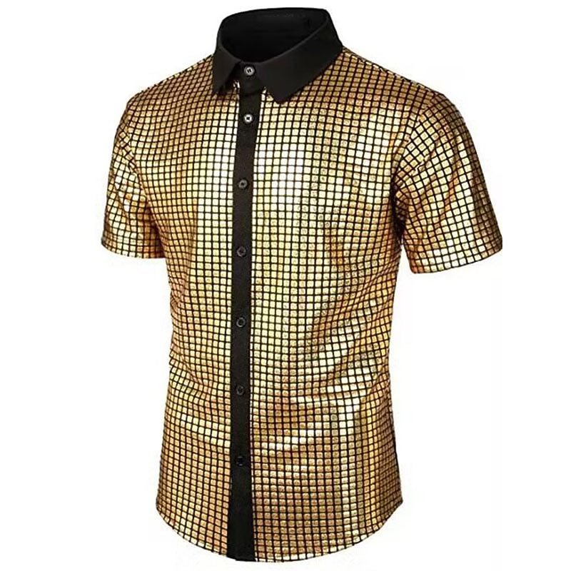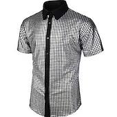 Highlights [Fabric]: Crafted from a blend with a shiny, satin-like finish, this men’s shirt offers a smooth and glossy look, achieving a vibrant, multicolored design that catches the eye. The fabric ensures comfort while maintaining an elegant appearance. [Fit]: The shirt features a modern and tailored fit, structured to enhance a sleek silhouette that complements various body types. With its short sleeves, it's perfect for warmer seasons. [Design Highlights]: This tuxedo-style shirt boasts a striking grid pattern and a sophisticated black collar and button placket. The addition of sequins provides a dazzling element, while the lapel neckline adds a classic touch. [Occasions]: Suitable for a range of events such as formal evenings, birthday parties, and disco nights, this shirt allows the wearer to make a bold fashion statement while maintaining an air of sophistication. [Size Range]: Available in sizes S, M, L, XL, and 2XL, ensuring a fit for a wide range of body types and preferences.