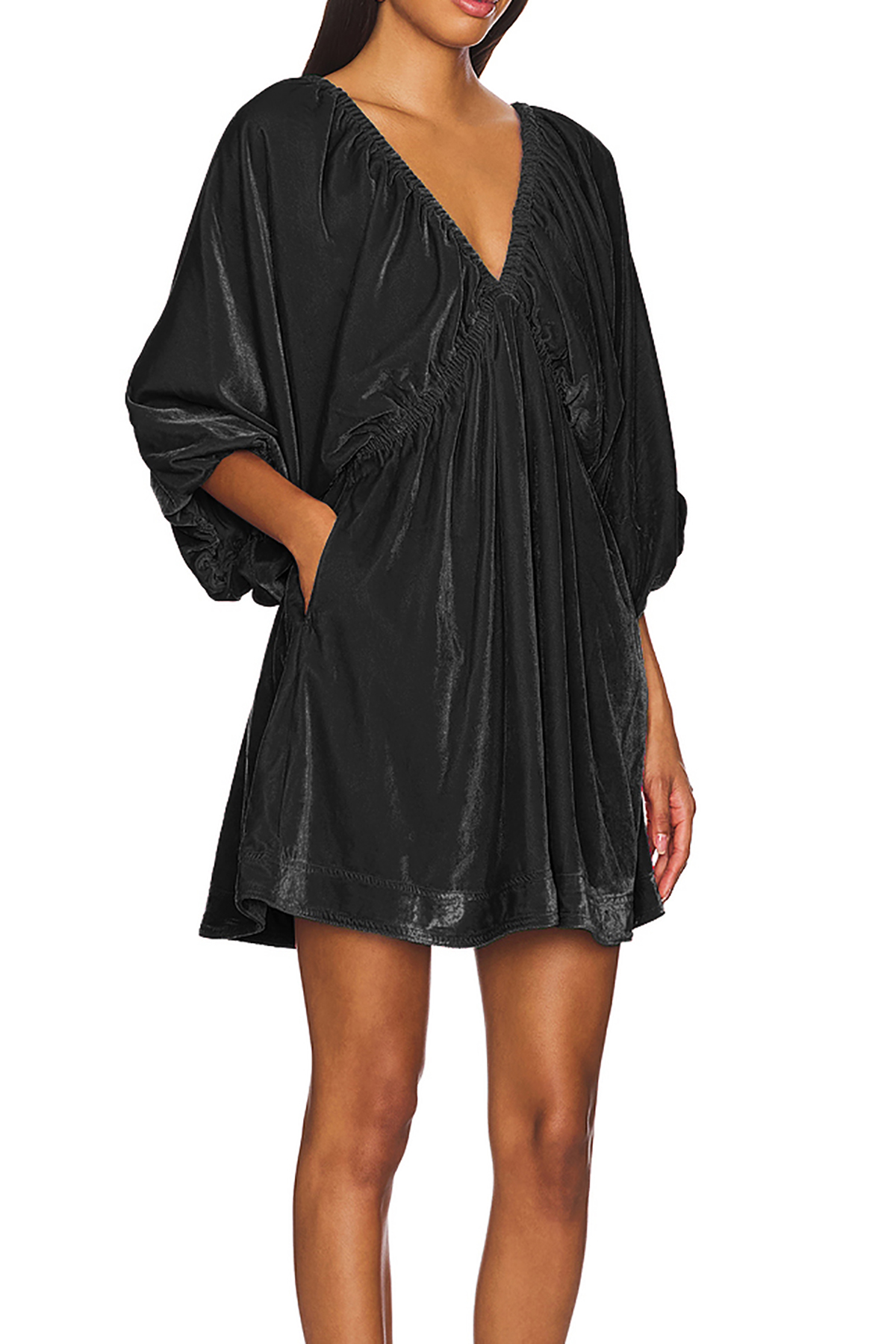 R.Vivimos Womens Fall Velvet Tunic Dress 2024 Trendy Sexy Deep V Neck 3/4 Sleeve Elastic Waist Loose Mini Dress with Pockets 13