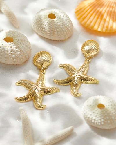 Chunky Gold Earrings for Women Trendy 14K Gold Plated Waterproof Statement Starfish Drop Dangle Earrings Hypoallergenic Summer Seashell Beach Vacation Ocean Earring Jewelry Essentials 6