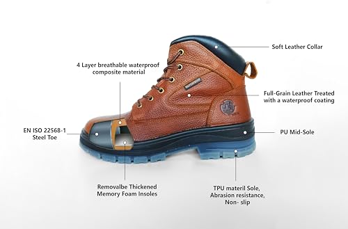 More information about J H Men's Waterproof Steel Toe Work Boots – Anti-Slip TPU Sole, 4-Layer Waterproof, Top-Grain Leather, Memory Foam Insoles…