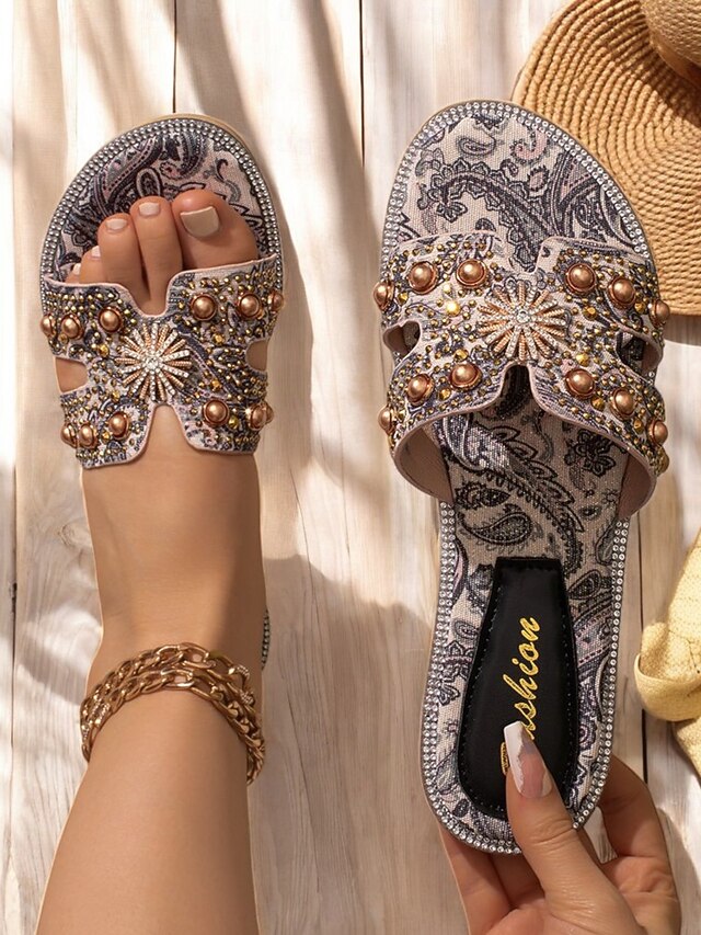 HOT ! Women's Bohemian Rhinestone Embellished Flat Sandals – Paisley Print Slip-On Summer Slides for Beach, Vacation & Casual Wear