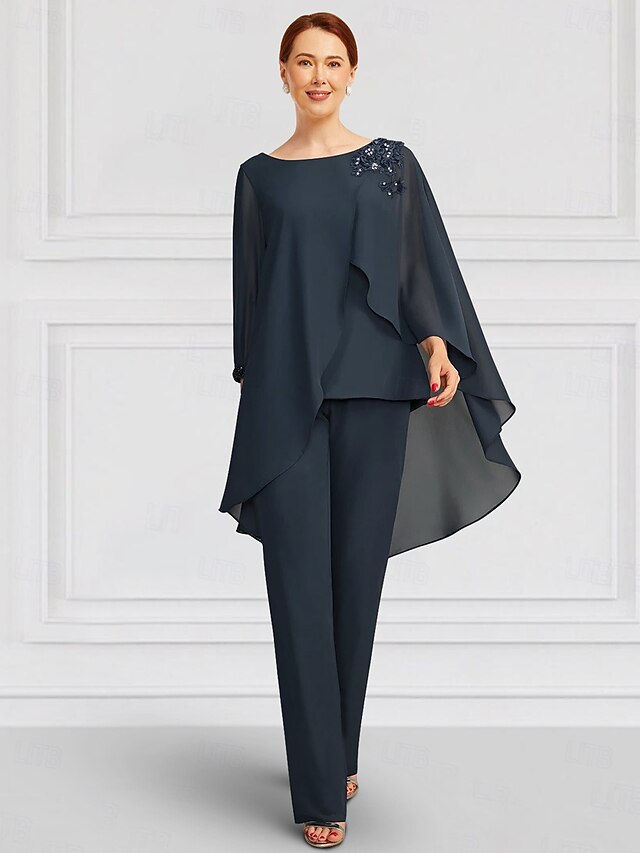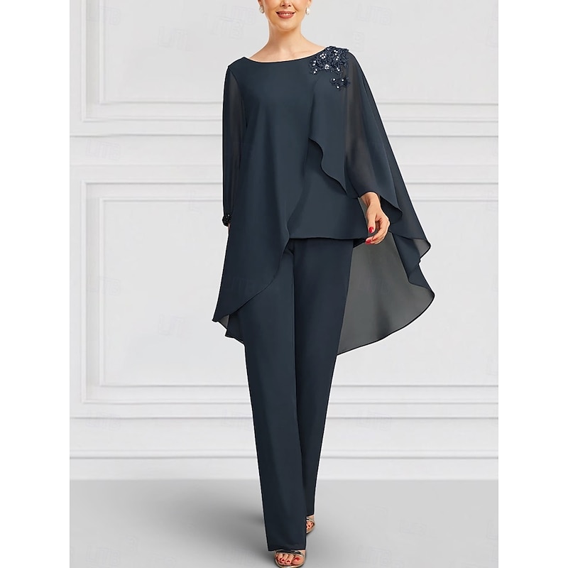 More information about Two Piece Pantsuit Mother of the Bride Elegant Jewel Neck Floor Length Chiffon Long Sleeve Wrap Included with Lace Ruffles Solid Color