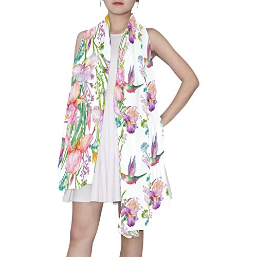 HOT ! Pink Exotic Flowers Flying Hummingbird Women Long Silk Scarf, Shawl Chiffon Large Stole Headscarf, Lightweight Sunscreen Satin Scarves Wraps for Wedding Party Gift