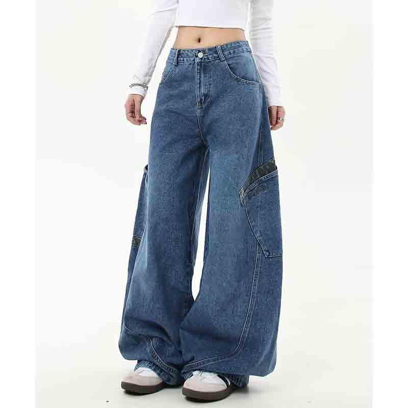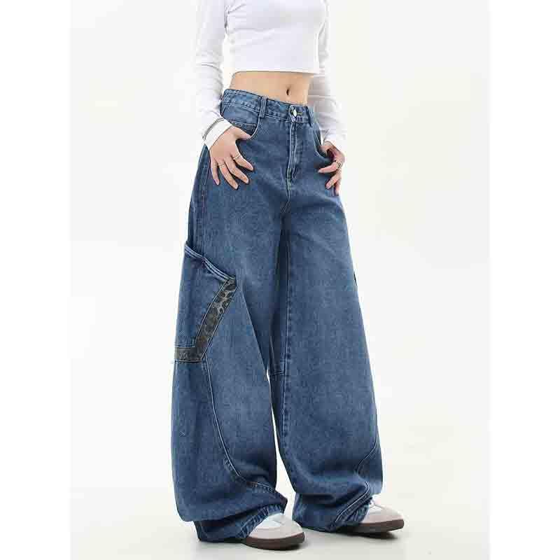 HOT ! Women's Retro Niche Vintage Jeans, Loose and Slimming Leopard Print Patchwork Curved Pants Wide Leg Jeans Woman
