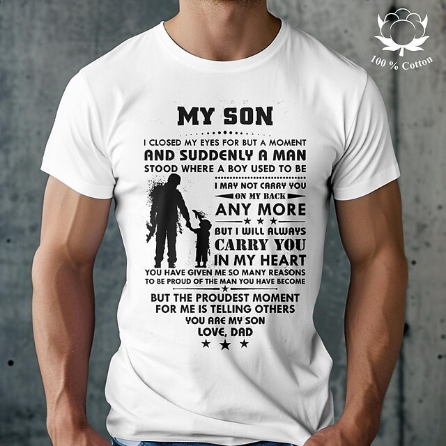 The standout feature of this T-shirt is the bold graphic design on the front. A heartfelt letter print, paired with a silhouette graphic of a father and son, adds an emotional dimension, making this a meaningful addition to any wardrobe. The contrasting text against the solid background ensures visibility and impact.